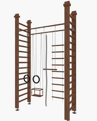 Навесной комплекс – это турник, который нужно закрепить в любой части стены. К этому турнику крепятся различные снаряжения, такие как кольца, лестница, канат, качели и т.д. Подходит комплекс такого типа больше для детей школьного возраста, чем для малышей. Для изготовления навесных спортивных комплексов используется прочный металл.