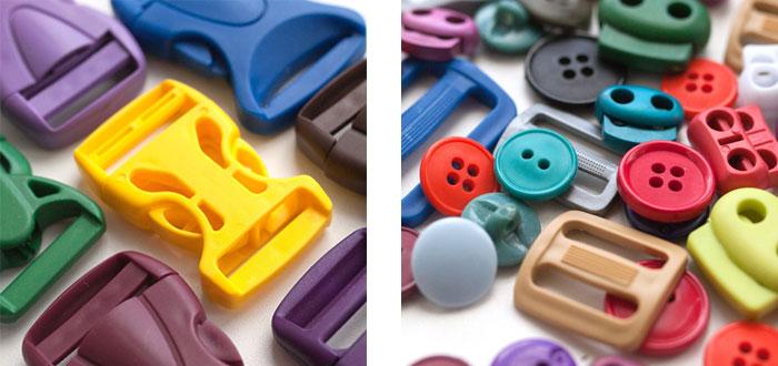 - Пластиковая фурнитура. В зависимости от нужд и функционала, такие виды делят на химустойчвые и термоустойчивые. На такой базе можно легко отпечатать герб, поэтому её не редко используют в форменной одежды. Особенно выгодны такие экземпляры для пошива детской одежды — они лёгкие, но функционал от этого не мельчает. Помимо одежды, данную фурнитуру используют в туристическом и рыболовном снаряжении. Да и обувная промышленность часто обращается к таким экземплярам.