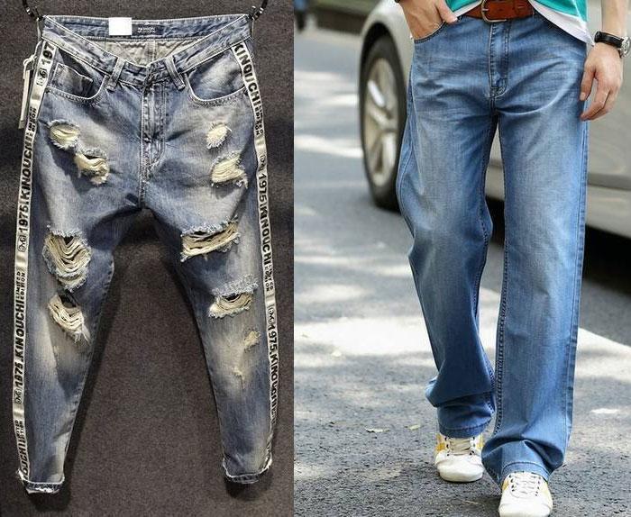 - фасон. Классика остаётся уместной, но законодатели мод настоятельно советуют обращать внимание на рваные детали. Также популярны джинсы-скинни и модели гораздо шире ног. Но в каждом из этих фасонов особое внимание должно уделяться отворотам и наличию потёртостей.